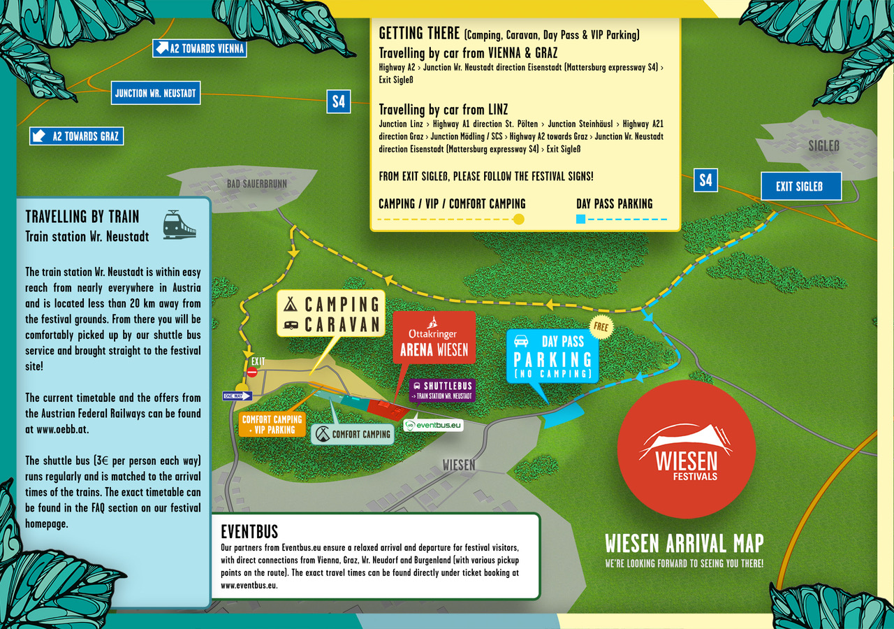Wiener Neustadt main station can easily be reached from everywhere in Austria. It is located just 20 km from the festival grounds Wiesen. From there the visitors are conveniently taken to the festival grounds! You can find the current timetable and the services of the Austrian Federal Railways (ÖBB) on www.oebb.at. The shuttle runs regularly and in accordance with the arrival times of the train. Tickets are available on the bus.